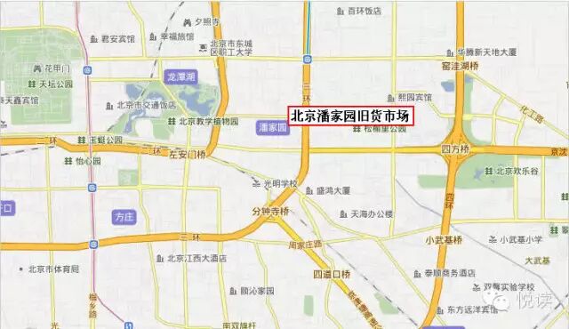 先看下北京地圖,潘家園在什麼地方?潘家園舊貨市場在東三環潘家園橋西。